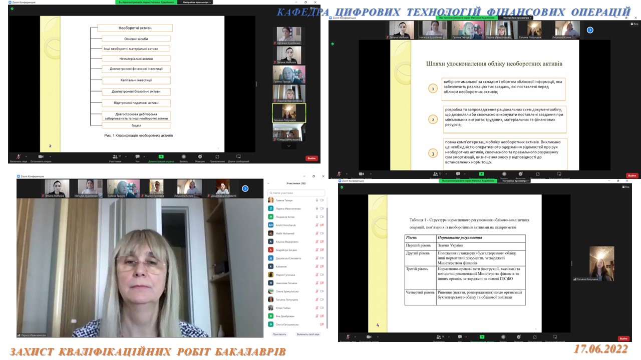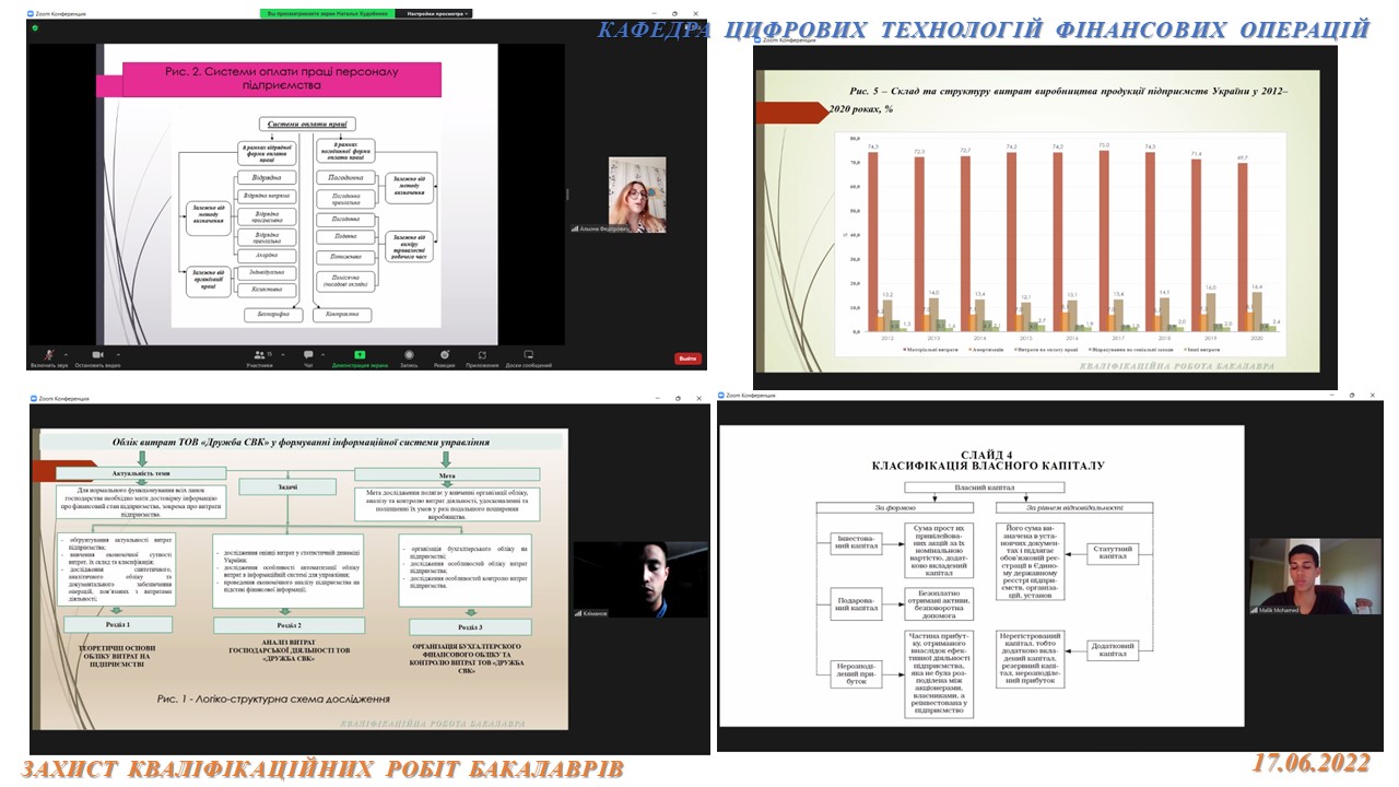 На кафедрі цифрових технологій фінансових операцій ОНТУ 17 червня 2022 року в онлайн-режимі успішно пройшов захист кваліфікаційних робіт бакалаврів спеціальності 071 «Облік і оподаткування». Результати дослідження актуальних тем здобувачів супроводжувалися презентаціями. Відзначимо високий рівень підготовки здобувачів вищої освіти, навички вирішення практичних завдань та прийняття креативних рішень.